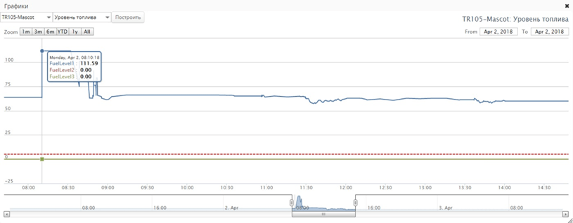 Благодаря сопоставлению графиков наполенности топливного бака и скорости движения ТС, показаний акселерометра Вы можете сделать выводы:
